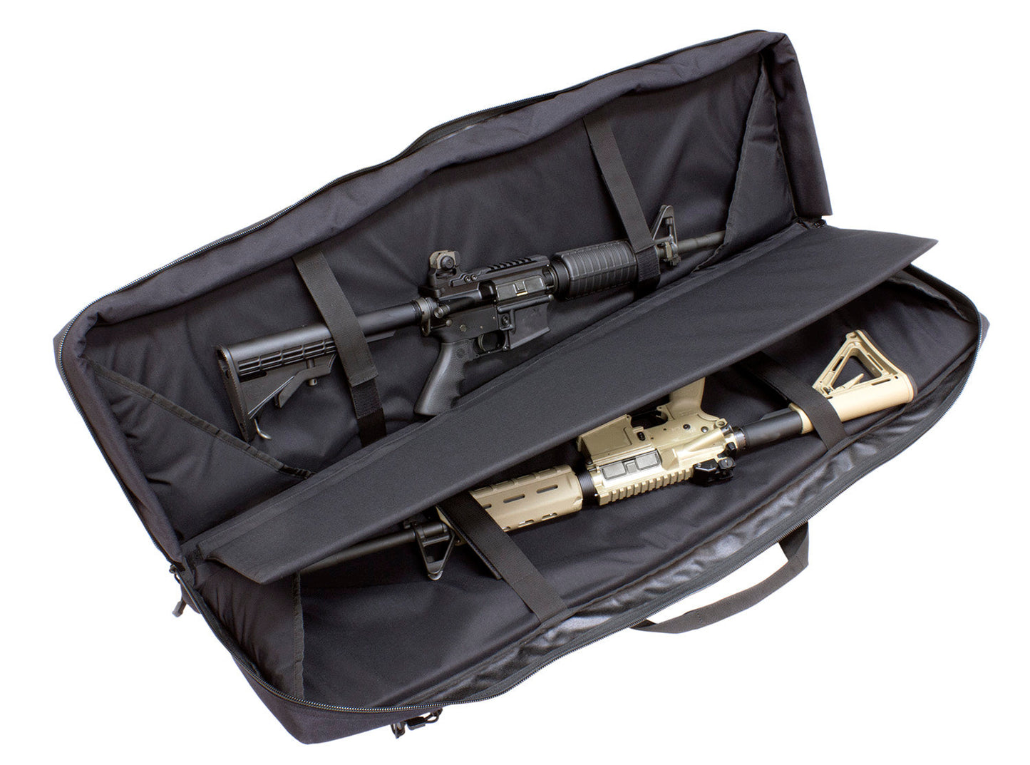 The Double Agent Case was designed to hold two weapons with an internal padded divider. This padded double rifle case is constructed of 1000 denier nylon with heavy-duty zippers and hardware, and wrap-around handles. The 1/2" closed cell foam padding provides extreme protection for your firearm.