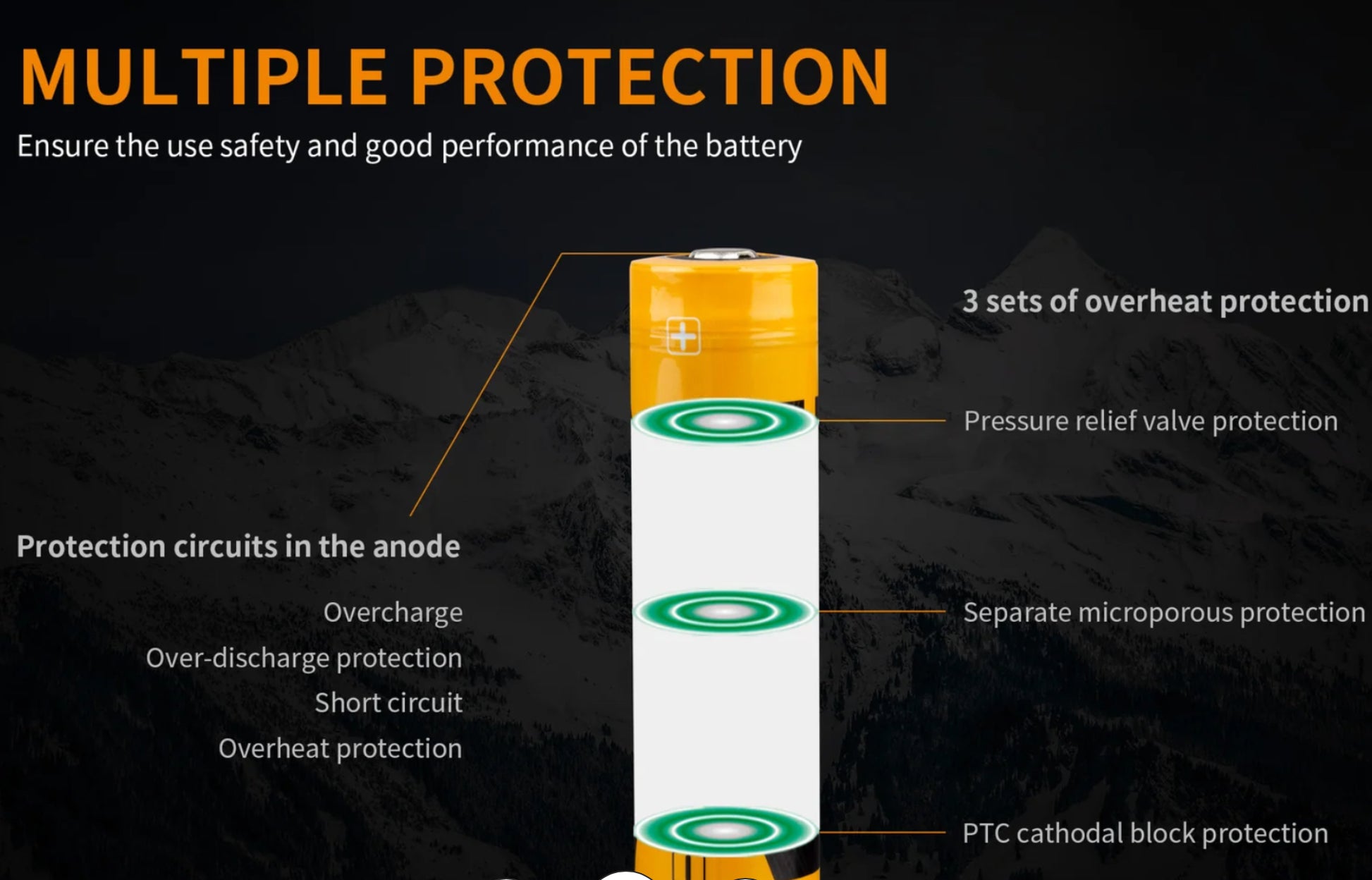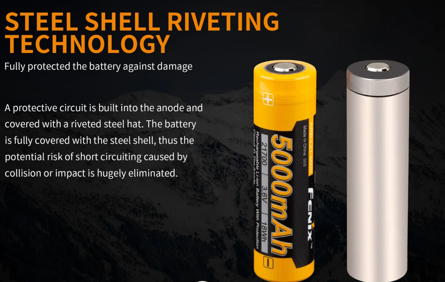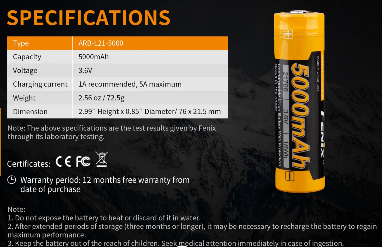 Fenix 21700 Rechargeable LI-ION Battery 5000 MAH - V2, Fenix ARB-L21-5000 V2 rechargeable 21700 battery provides the voltage and power needed for extended runtime and higher lumen capacities. The ARB-L21 comes with all the bells and whistles of high-quality Fenix batteries, including protective circuits inside the anode and up to 500 charging cycles. Also included are the three sets of overheat protection: pressure relief, microporous, and PTC cathodal block. Don't run out of light; pick up a spare 21700 battery today!THIS BATTERY IS NOT AN 18650, AND IT IS NOT COMPATIBLE WITH 18650 FLASHLIGHTS OR OLDER-STYLE CHARGERS (such as the ARE-C1 and other "C Series" chargers). COMPATIBLE CHARGERS ARE THE ARE-A2, ARE-A4, ARE-D1, OR ARE-D2. This battery does not have a USB port for direct charging.