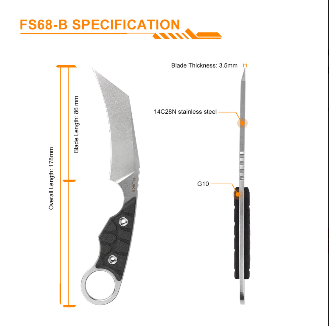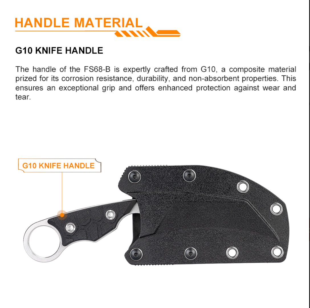 The FS68 fixed-blade Knife, a compact powerhouse weighing in at just 70.5 grams. Its unique Bird's Beak blade ensures swift and precise handling of preparation tasks. Crafted from high-quality Sandvik 14C28N steel, it guarantees a razor-sharp cutting experience. The ergonomic design provides a comfortable grip, allowing for extended use without fatigue. Whether for outdoor adventures or daily tasks, it's lightweight, portable, and ready for action, it's the perfect tool for those who demand both performance and convenience from their gear.