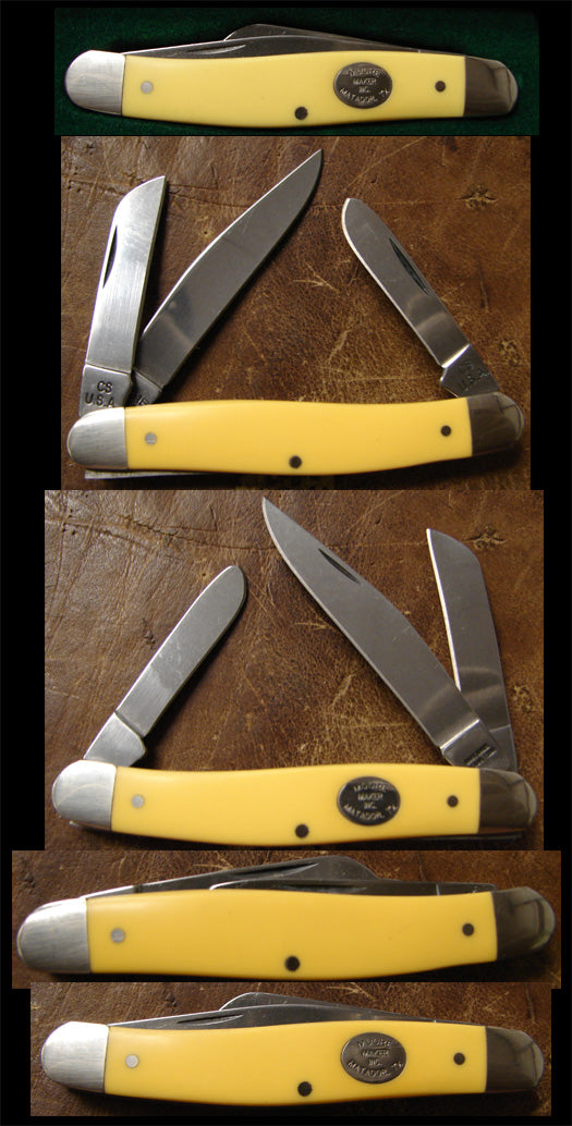 This knife from Moore Maker features smooth Delrin handles. Each has a Moore Maker shield imbedded into the handle, and MOORE MAKER, INC., MATADOR TEXAS on mark side of blade tang. MADE IN U.S.A. and model number on pile side of tang. These knives are ideal for company giveaways or everyday use, and they can be customized with initials or company logos. The Working knives offer Moore Maker quality at a slightly more affordable price.