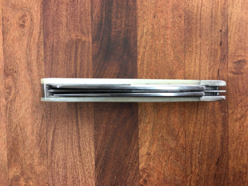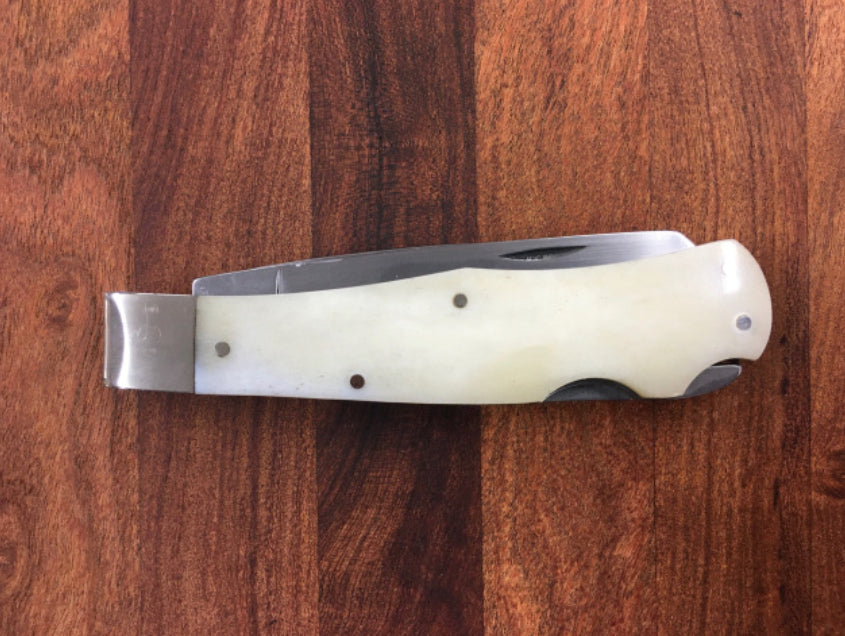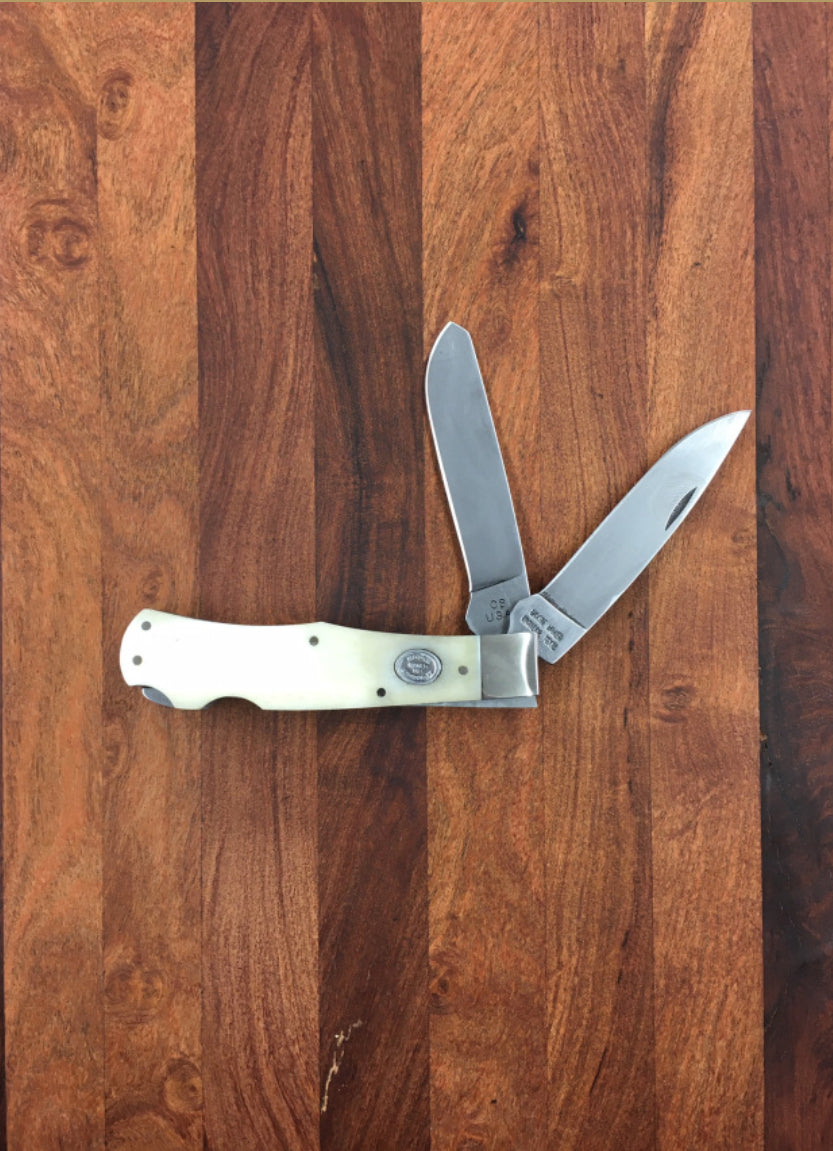 Moore Maker #5206DLB - Large Double Locking Trapper - 4-1/2” Unique Double Lockback design. White bone handles. Comes with vertical scabbard.Made in the USA.