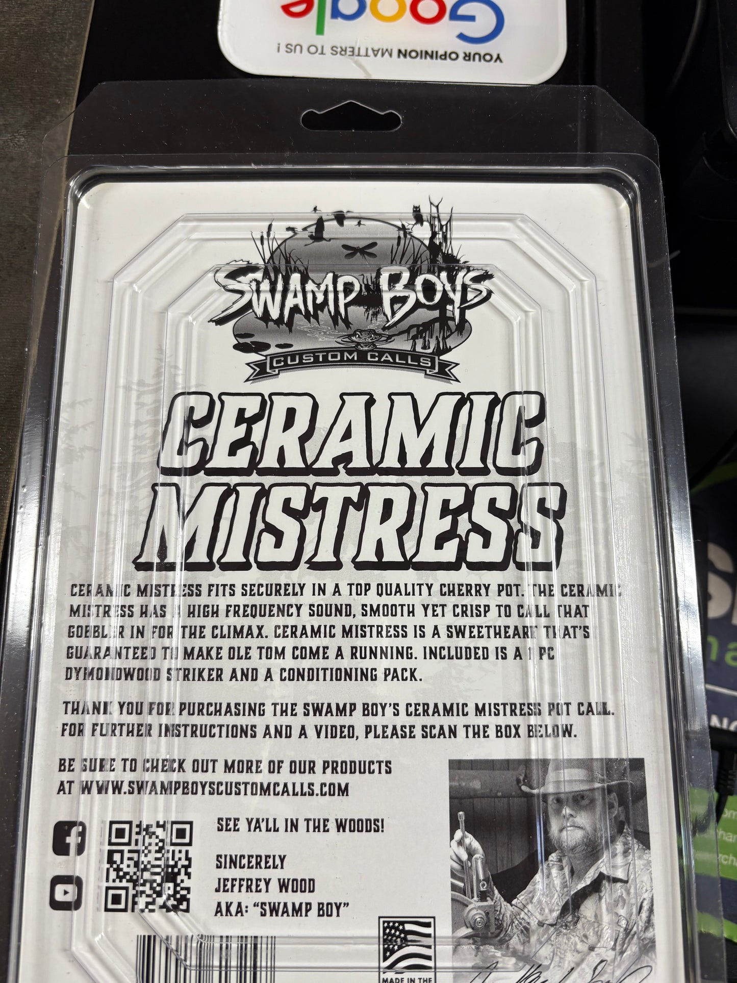 Ceramic Mistress fits securely in a top quality cherry pot. The Ceramic Mistress has a high frequency sound, smooth yet crisp to call that gobbler in for the climax. Ceramic Mistress is a sweetheart that's guaranteed to make ole tom come a running. Included is a 1 PC Dymondwood Striker and Conditioning Pack.
