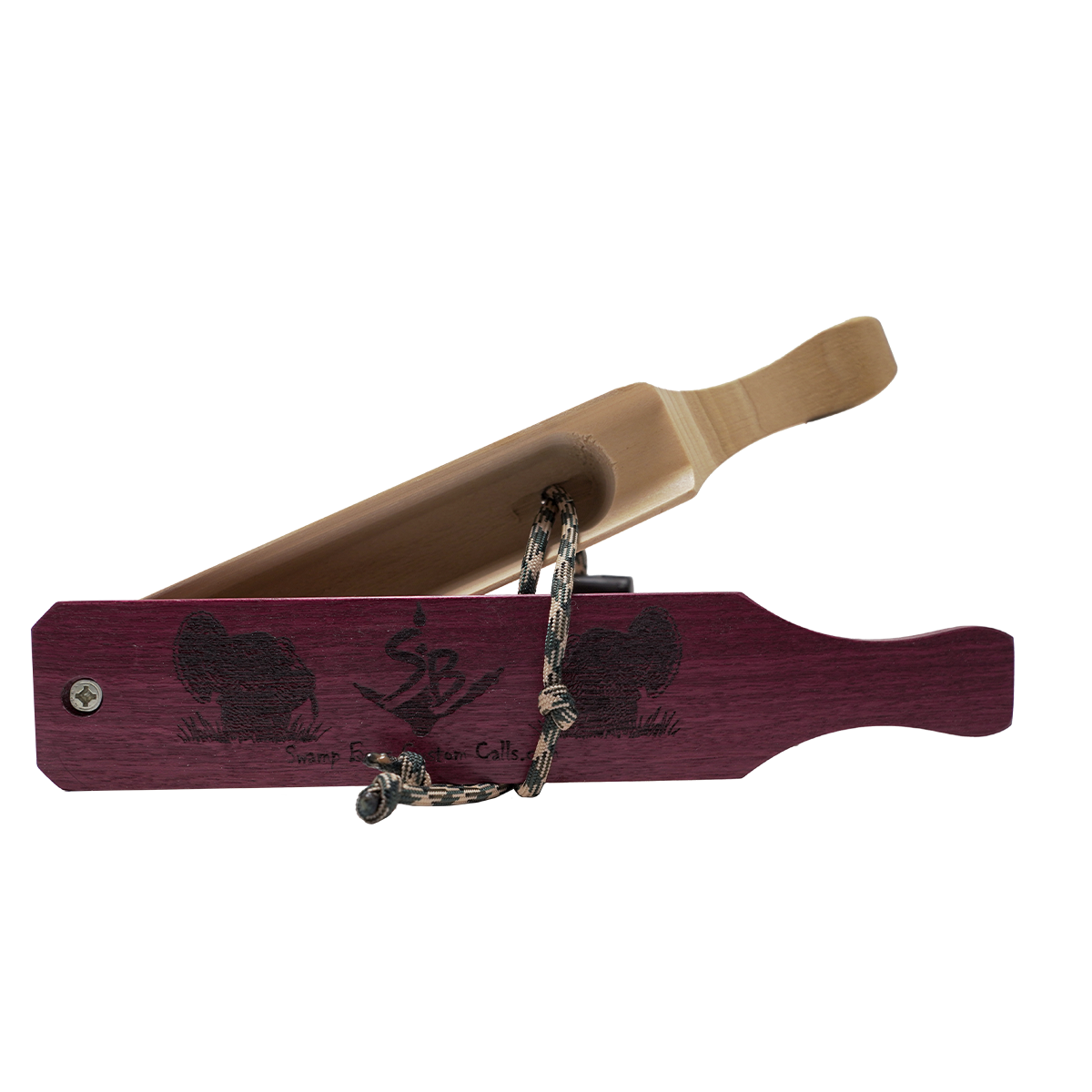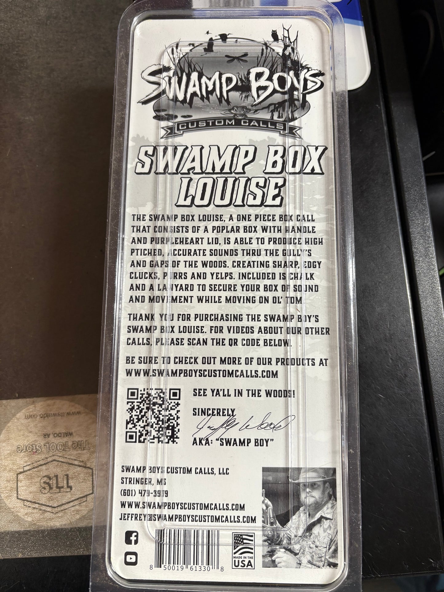 The Swamp Box Louise, a one piece box call that consist of a poplar box with handle and purpleheart lid, is able to produce high pitched, accurate sounds through the gullies and gaps of the wood. Creating sharp, edgy clucks, purrs and yelps. Included is chalk and a lanyard to secure your box of sound and movement while moving on ole toms.