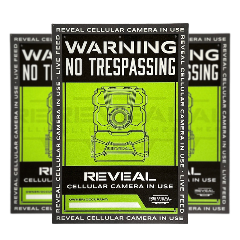 Tactacam's REVEAL No-Trespassing Signs inform potential intruders of active REVEAL cellular cameras in the area. Protect your property with high visibility signage. 3 per package.